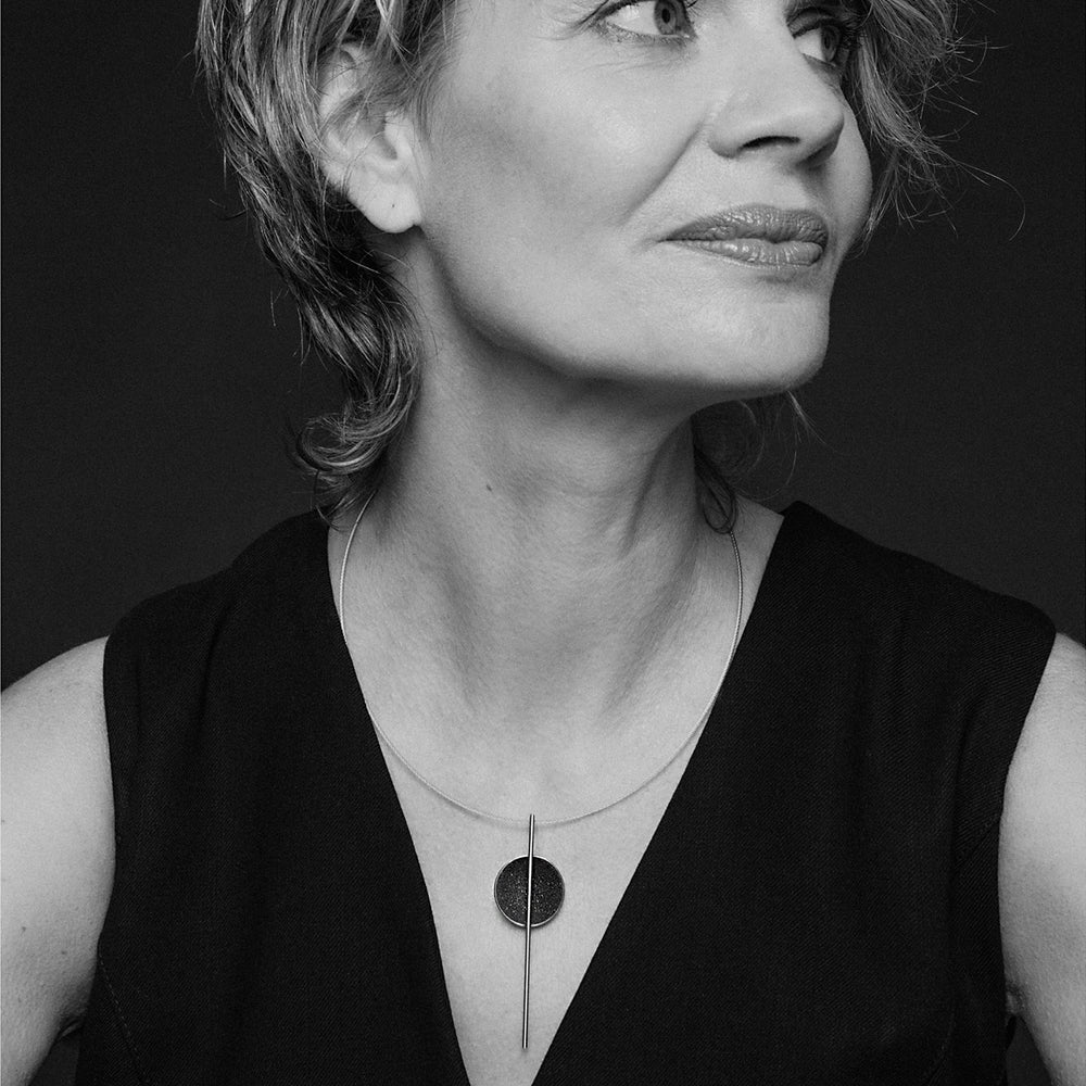 The Infini Necklace by KONZUK features an elongated vertical linear element intersecting the concrete and diamond dust dome. Its Bauhaus inspired geometry forms a simple, elegant necklace. Handmade in Canada.