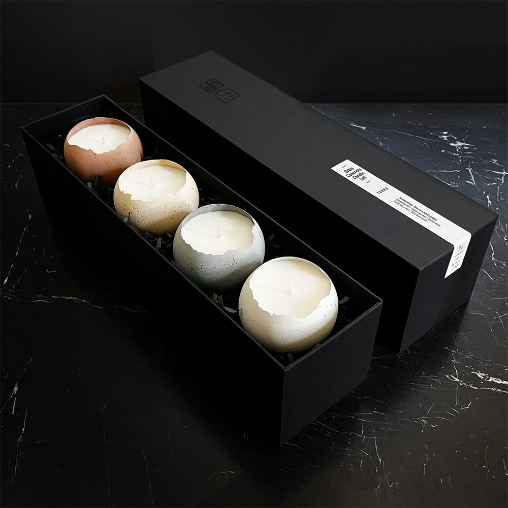 The Orbis Terra Box Set, by KONZUK, includes the Orbis Terra concrete candles in their four earth tones; adobe, stone, sage, and sand. This set has the complete variety of colors and scents from the Terra collection.