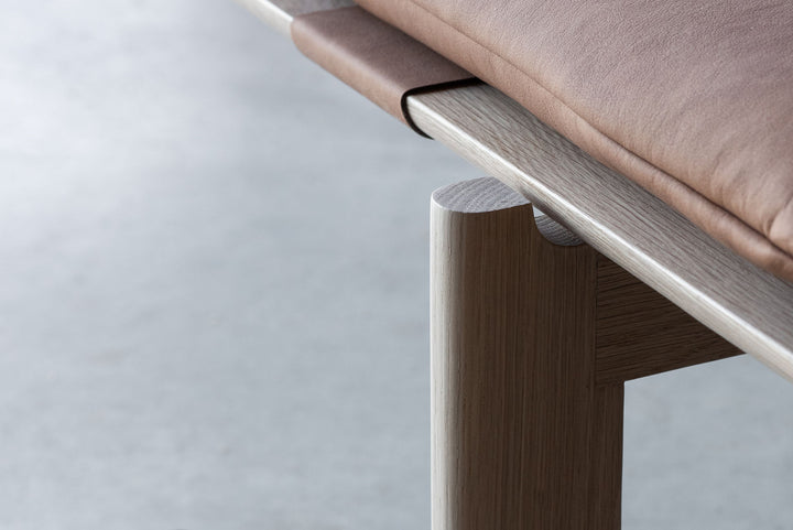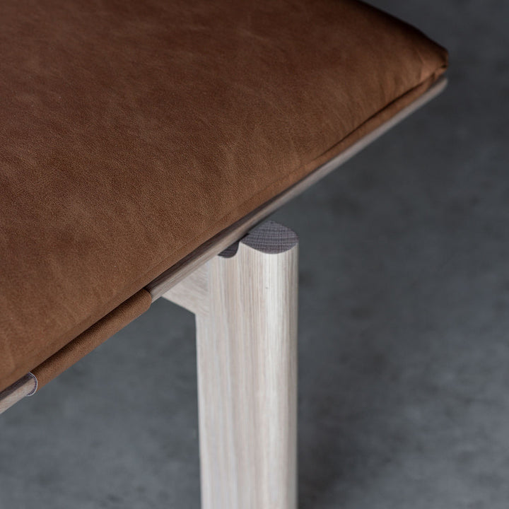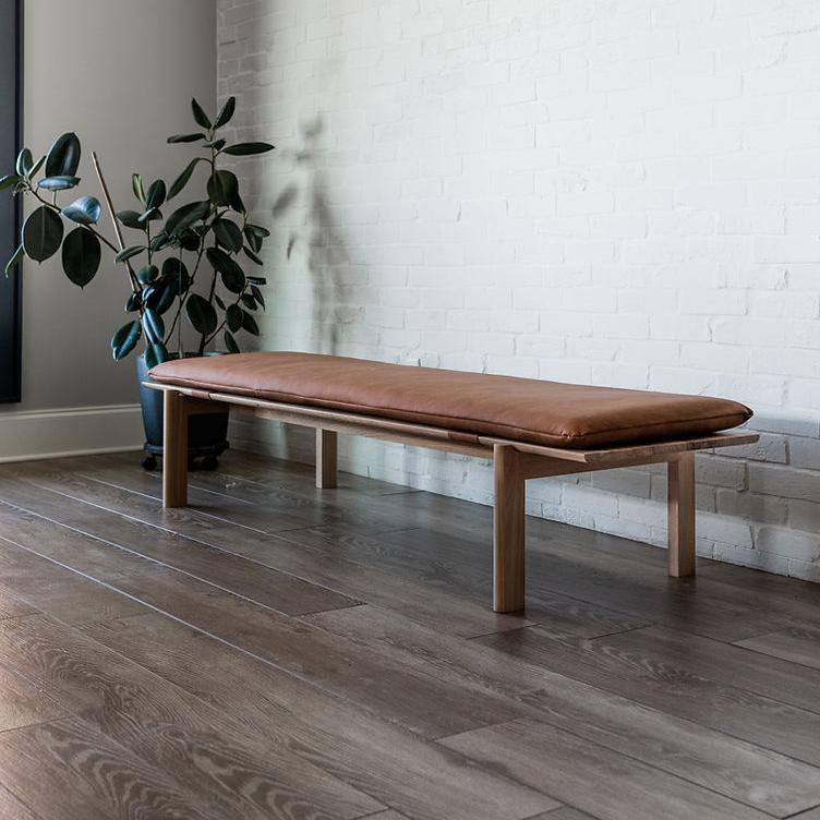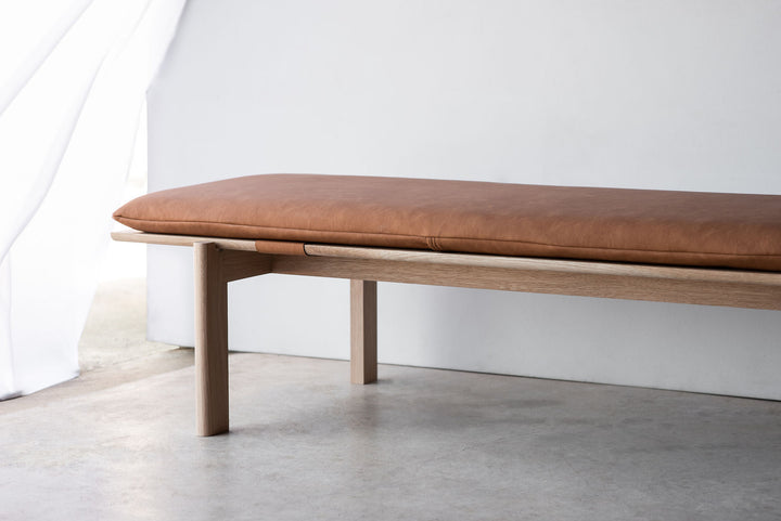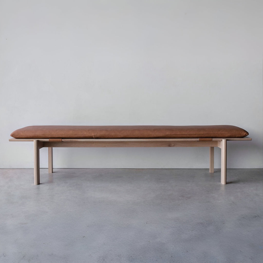 The Opia Bench by Komolab is a beautiful fusion of simplicity, craftsmanship, and modern design. Handcrafted by founder Kyle Comeaux in his Louisiana studio, this piece is made from solid white oak, highlighting the wood’s natural grain and warm tones. The clean, minimalist lines are complemented by a plush, high-quality faux leather cushion, offering both style and comfort.