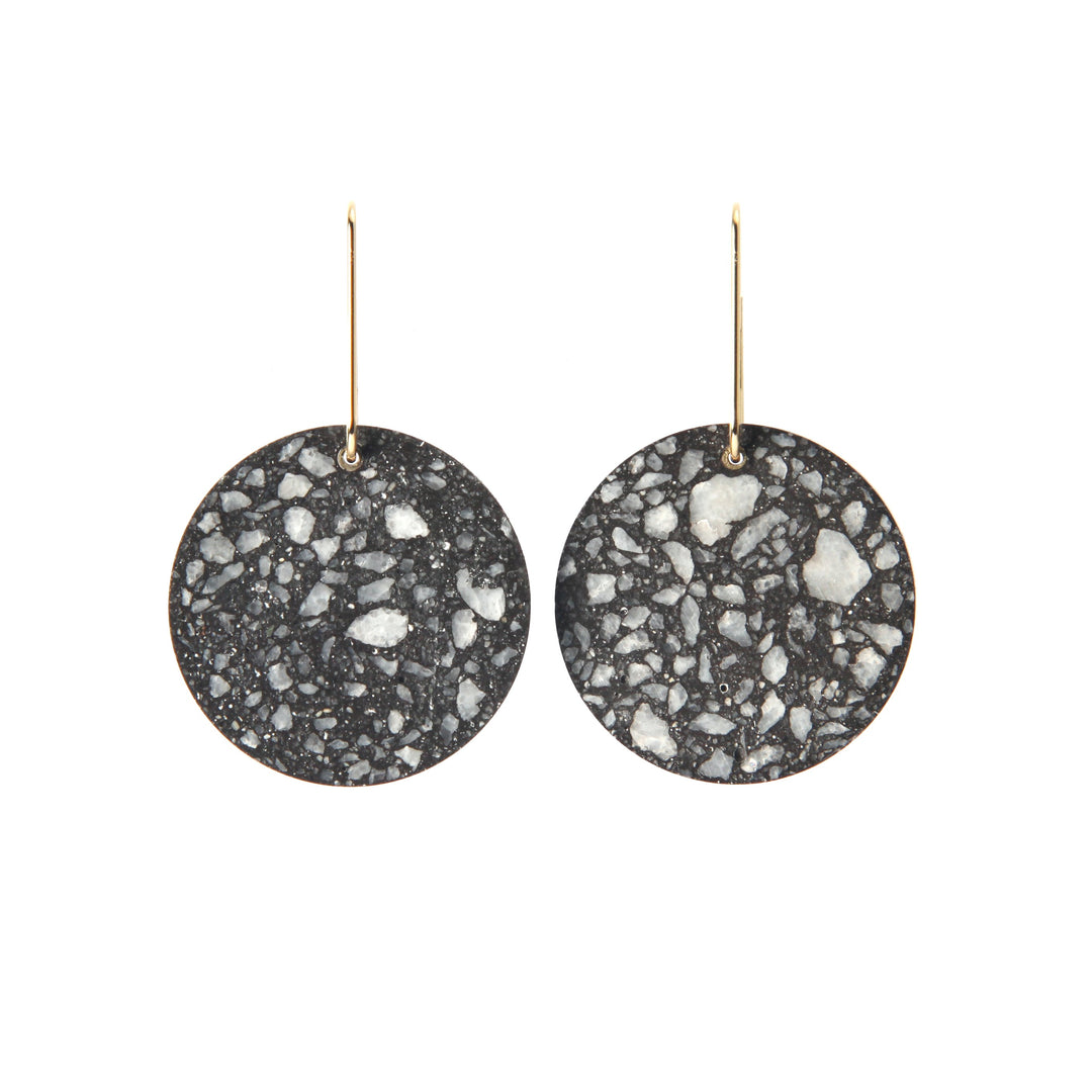 Woman Model Wearing 22STUDIO Concrete Circle Earrings In Dark Gray