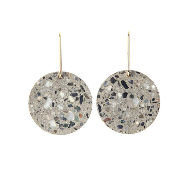 A meticulous production process forms the quietly striking image of the Circle Earrings—blending, pouring, finishing, sanding, and polishing. Each earring develops its personality as the small marble fragments arrange in unique patterns. The 18K gold-plated hooks add a lustrous yet minimal touch.