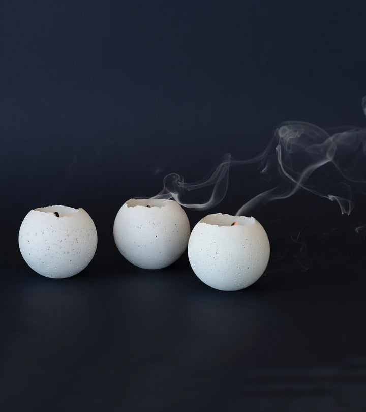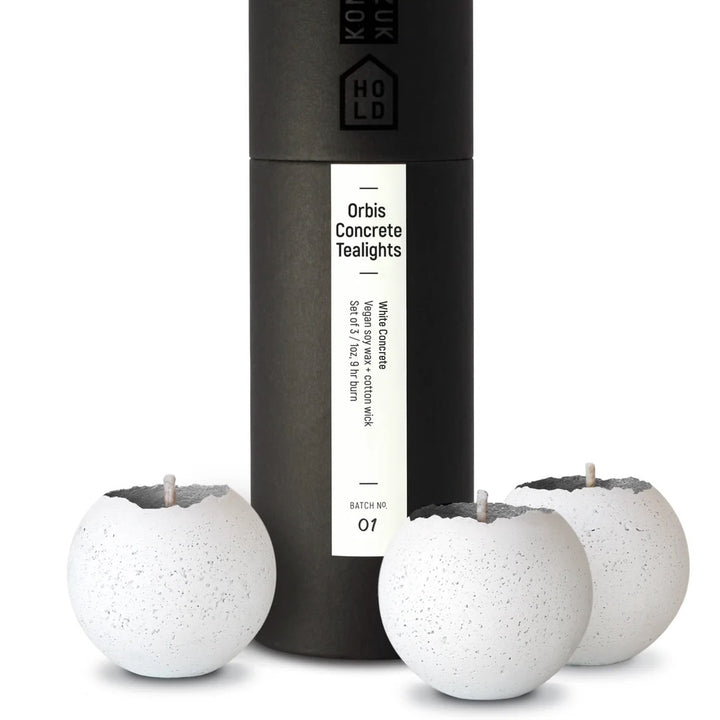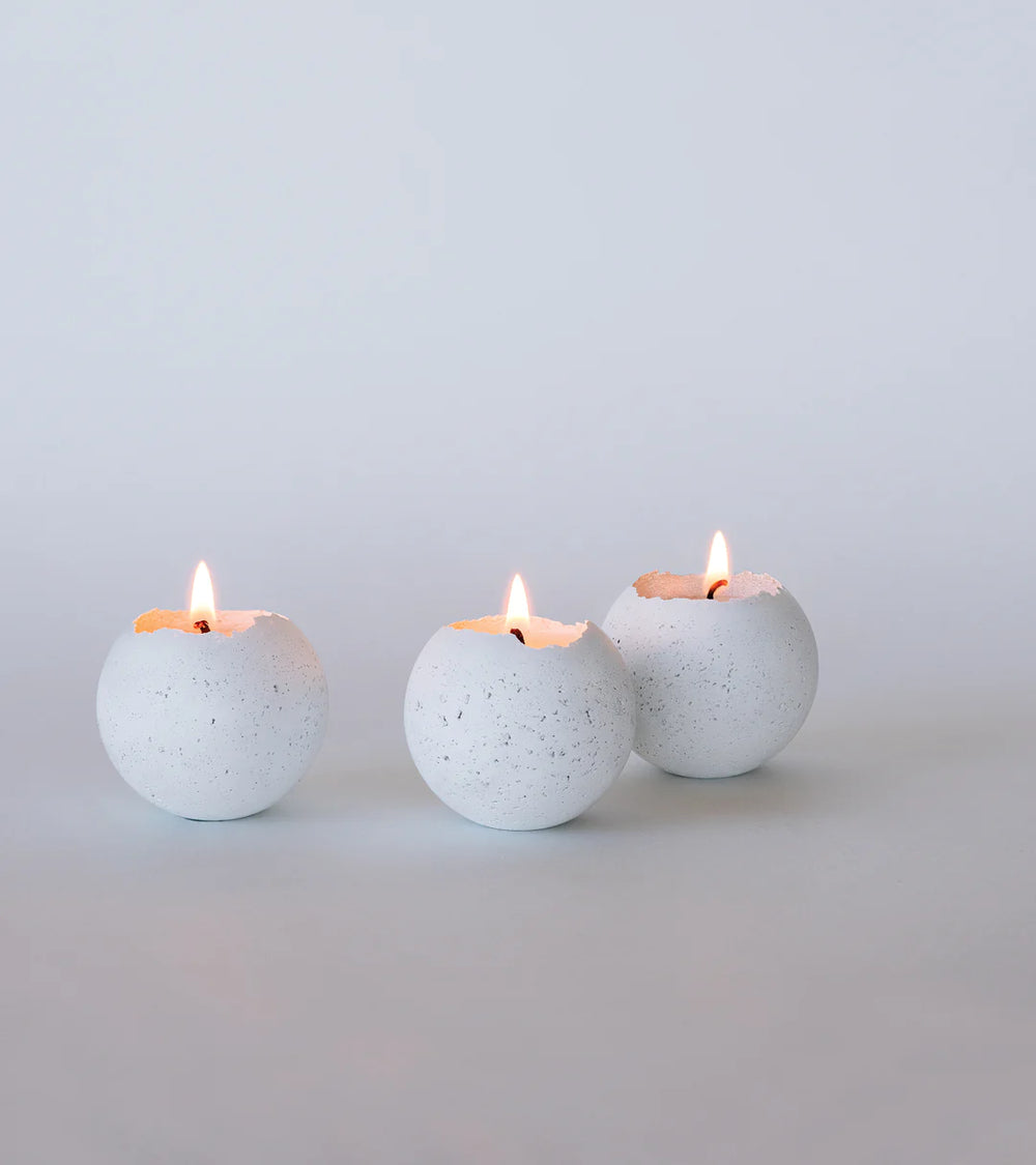 Enhance your space with the S - Orbis Concrete Tealights x3 White by KONZUK. These tealights feature a raw, minimal design and are crafted with vegan soy wax candles, creating a peaceful atmosphere in any room. They can be used as an ambient cluster or as three distinct design objects. The medley of spheres promotes calm and mindfulness when thoughtfully placed in your interior. Handmade in Canada.