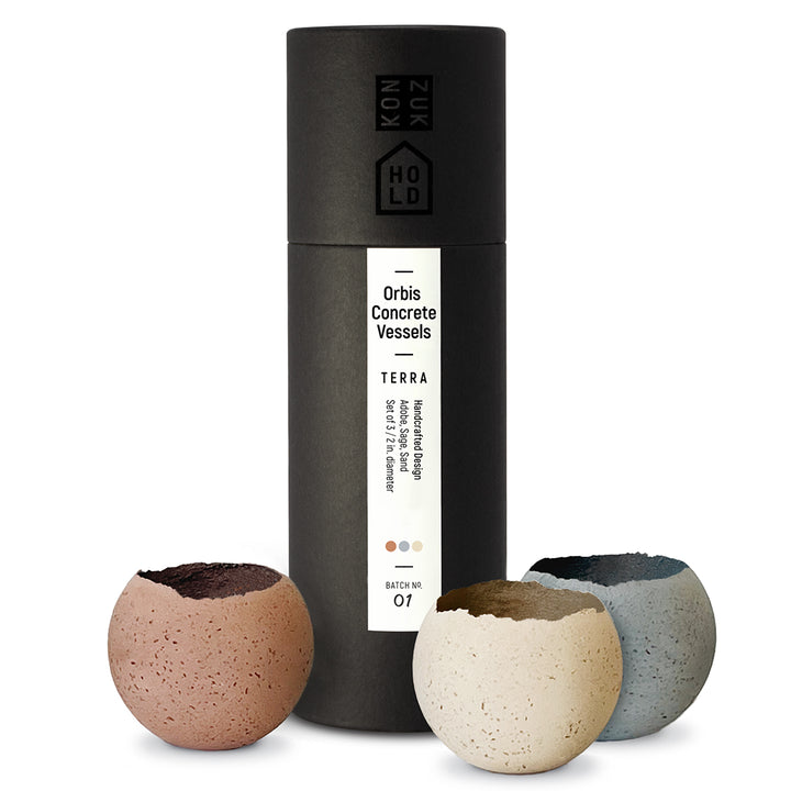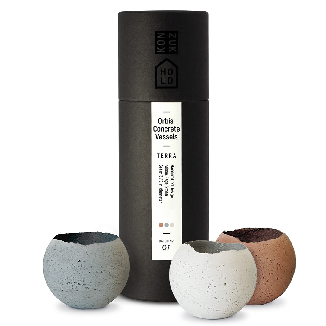 The S - Orbis Concrete Vessels x3 by KONZUK is a trio of vessels that serve as an ambient cluster or three distinct design objects. With their raw, minimal shapes, and varied tones, they will create a peaceful atmosphere in any space. It comes with three of the four earth tones available for this collection: Adobe, Stone, Sage, and Sand.