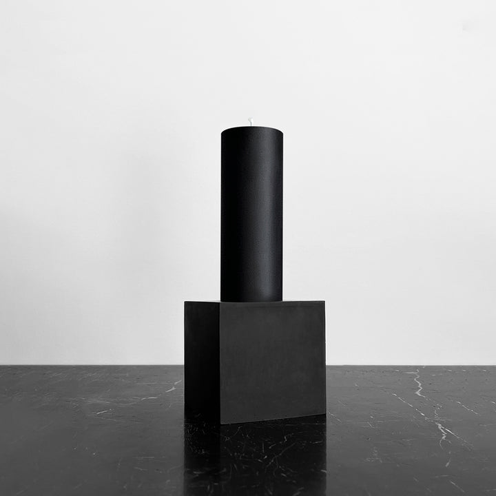 A cast-by-hand concrete cube prominently displays a hand-poured beeswax pillar candle.