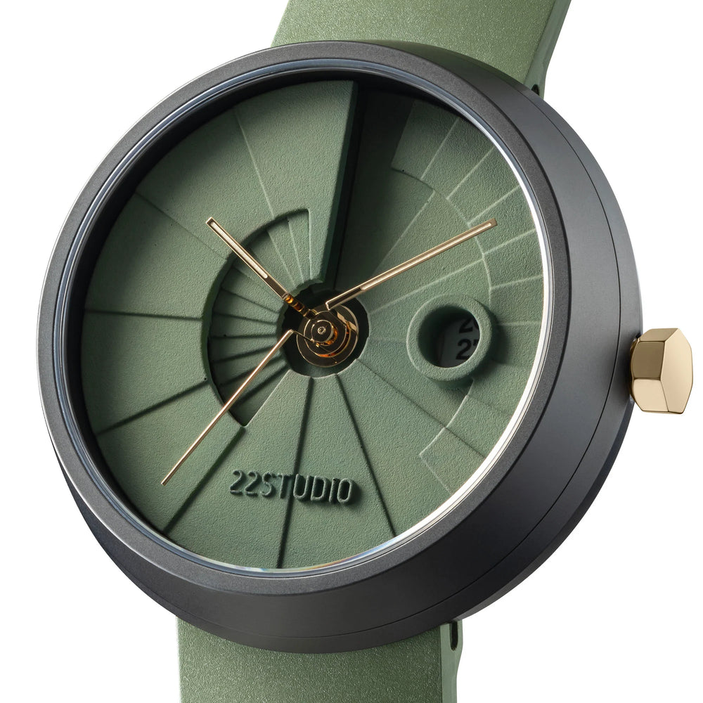 Celebrate a decade of innovation with the 4D Concrete Watch Decade Anniversary Edition Moss by 22STUDIO. This unique timepiece combines time and three-dimensional space concepts, featuring a 44mm matte black PVD case, pine green concrete dial, and moss green rubber strap. Perfect for outdoor enthusiasts, this watch pairs well with earth-toned clothing and functional apparel.